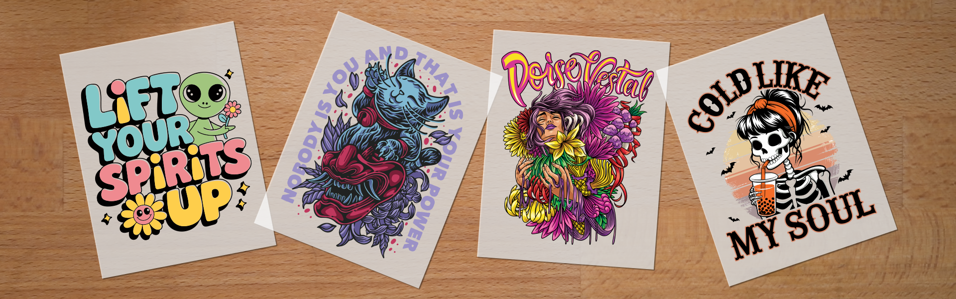 Our DTF transfers use PET film, vibrant eco-friendly inks, and a durable adhesive powder for full-color, ready-to-press designs.