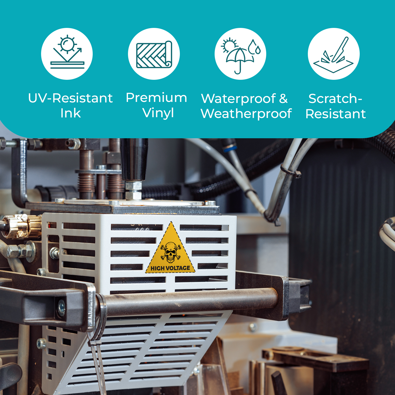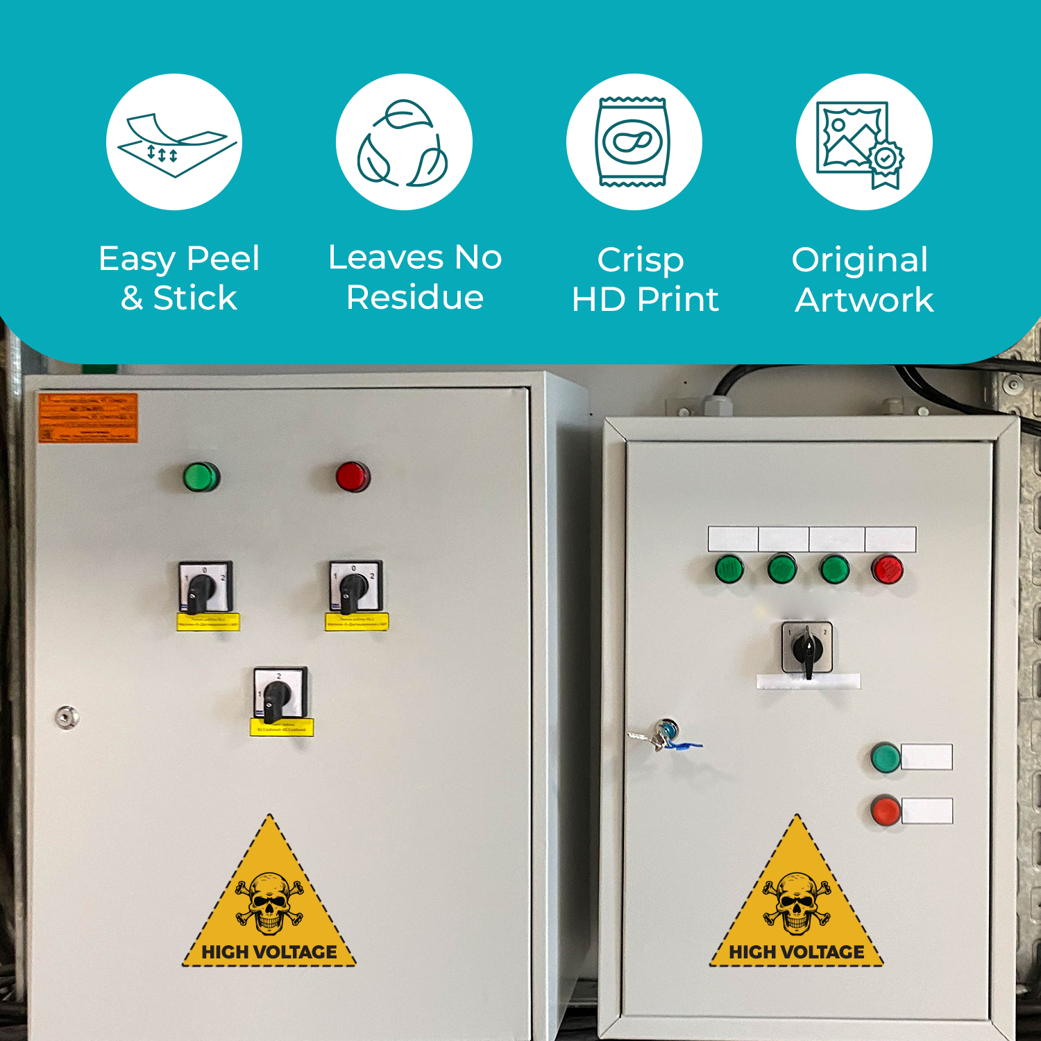 Stay safe and compliant with our bold “High Voltage” warning stickers from StickerJet. This 2-pack includes two 4” x 4” triangular vinyl stickers featuring a high-impact skull-and-crossbones symbol and bold “HIGH VOLTAGE” text on a bright yellow background.