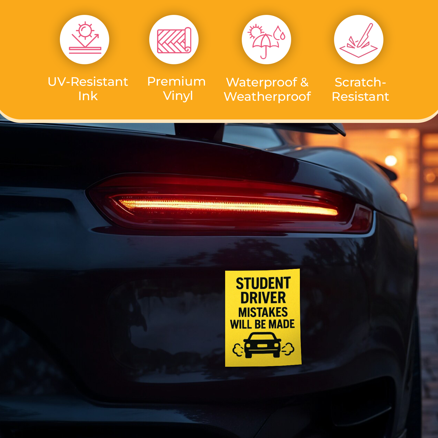 Ease road anxiety and promote safety with our “Student Driver – Mistakes Will Be Made” stickers by StickerJet. This 2-pack includes two 4 x 4 inch bold yellow vinyl decals featuring a fun, attention-grabbing design that signals to nearby drivers to be patient with new drivers.