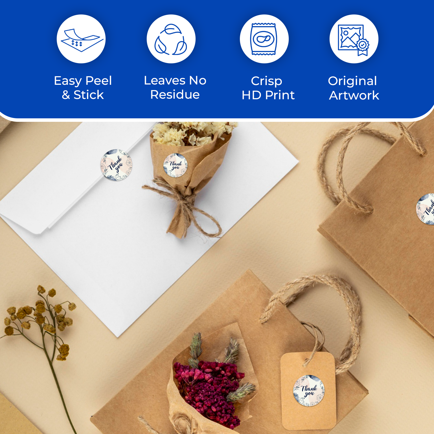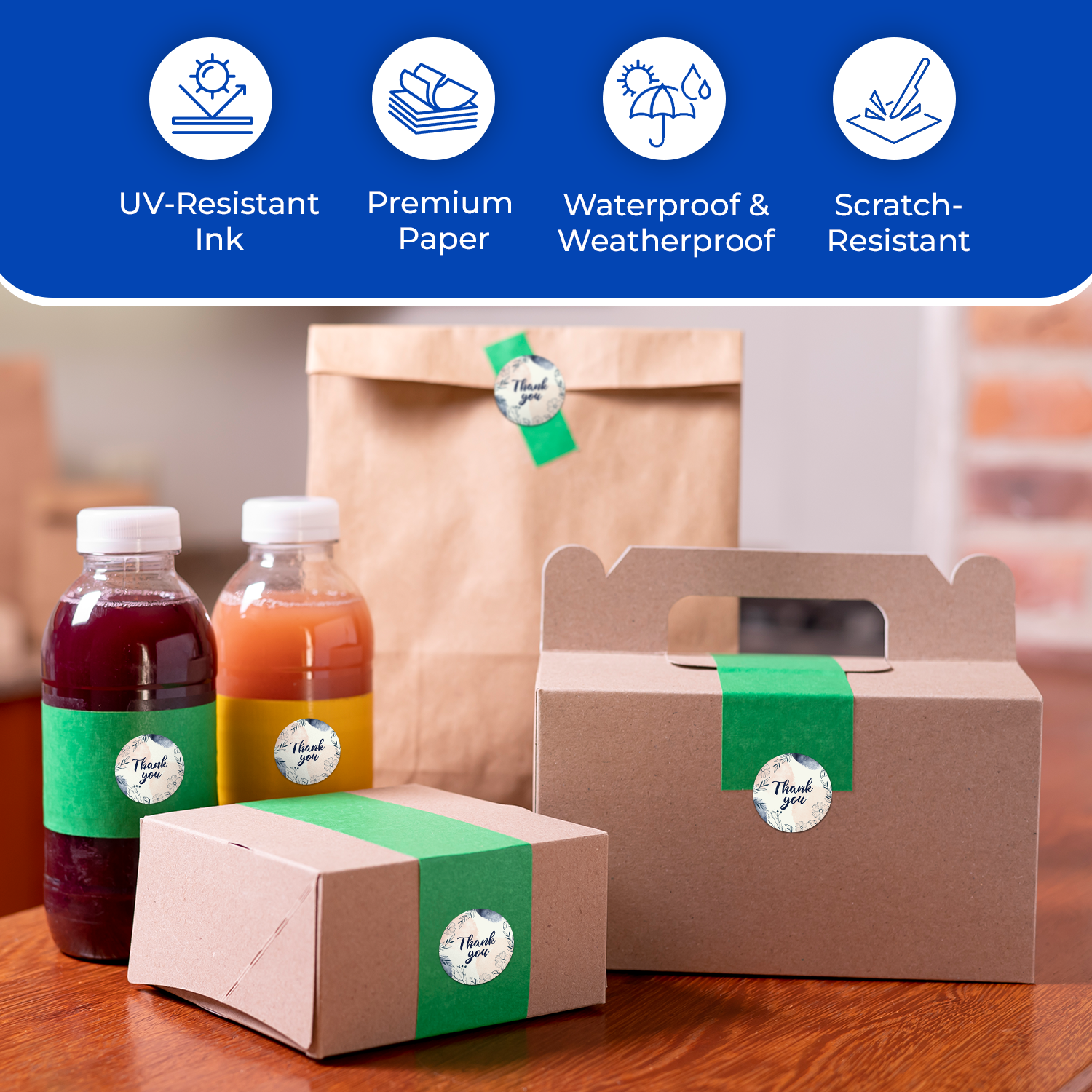 Proudly made in the U.S. from high-quality paper and vibrant inks. Each sticker features strong adhesive for secure application to envelopes, boxes, and other packaging surfaces.